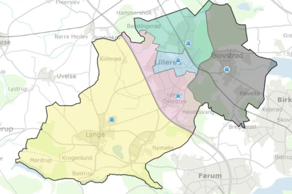 Allerød Kommune er inddelt i fem afstemningsområder, vist med farver på kortet. Din adresse afgør, hvilket afstemningsområde, du tilhører og hvilket valgsted, du kan stemme på.